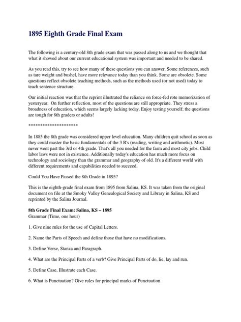 Read Online 8th Grade Exam 1895 Answers PDF online is a convenient and frugal way to read 8th Grade Exam 1895 Answers you love right from the comfort of your own home. Yes, there sites where you can get PDF "for free" but the ones listed below are clean from viruses and completely legal to use.